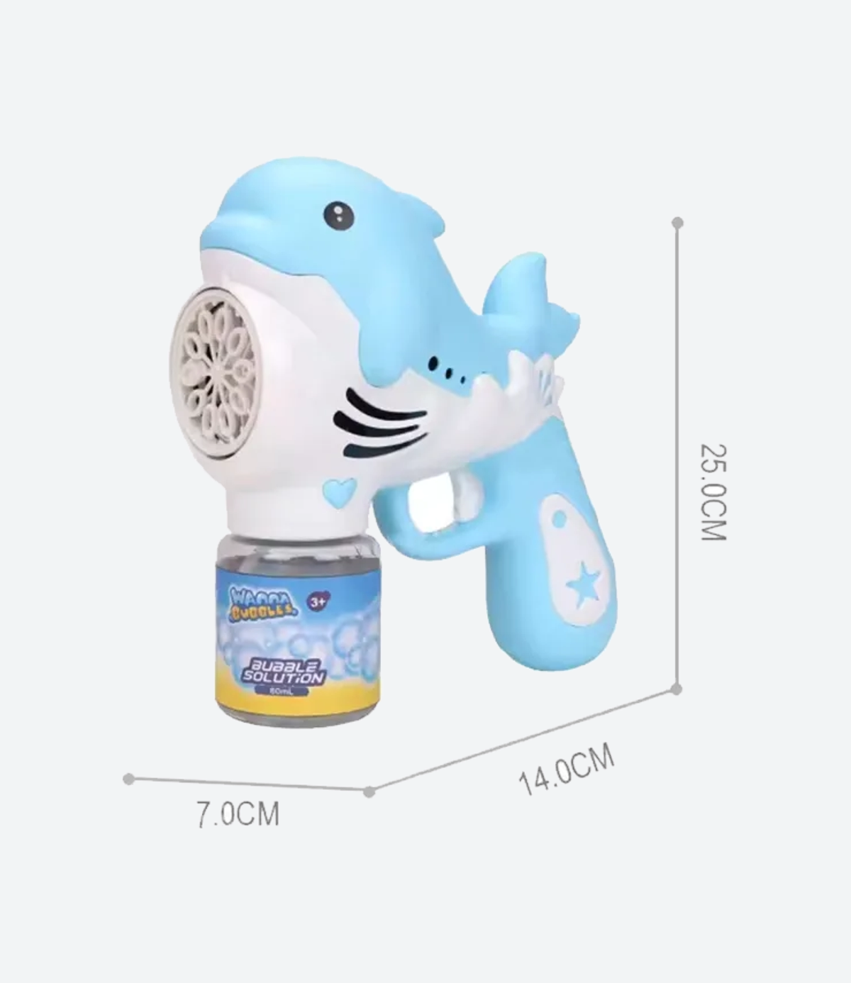 Su diseño adorable en forma de delfín no solo atrae la mirada, sino que invita a la imaginación: ¡el pequeño sosteniendo su compañero acuático listo para aventuras en el jardín, en el parque o en la terraza! La pistola burbujera es ligera y fácil de manejar, pensada para manos de niños y niñas, para que puedan jugar sin límites y sin esfuerzo.