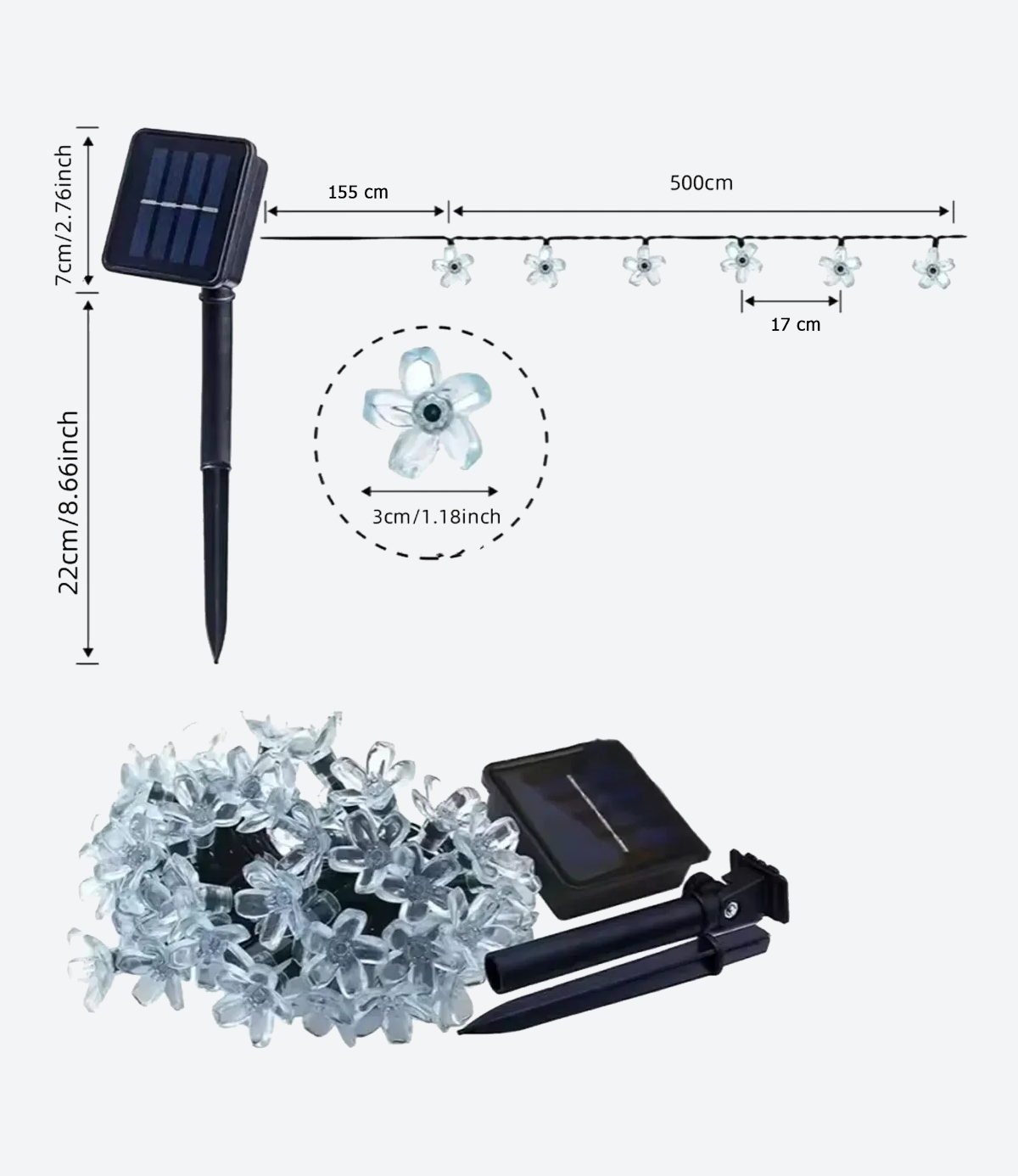 El tramo de la guirnalda que contiene las Flores es de 5 metros + 1,55 mts de Cable hasta el panel solar.
