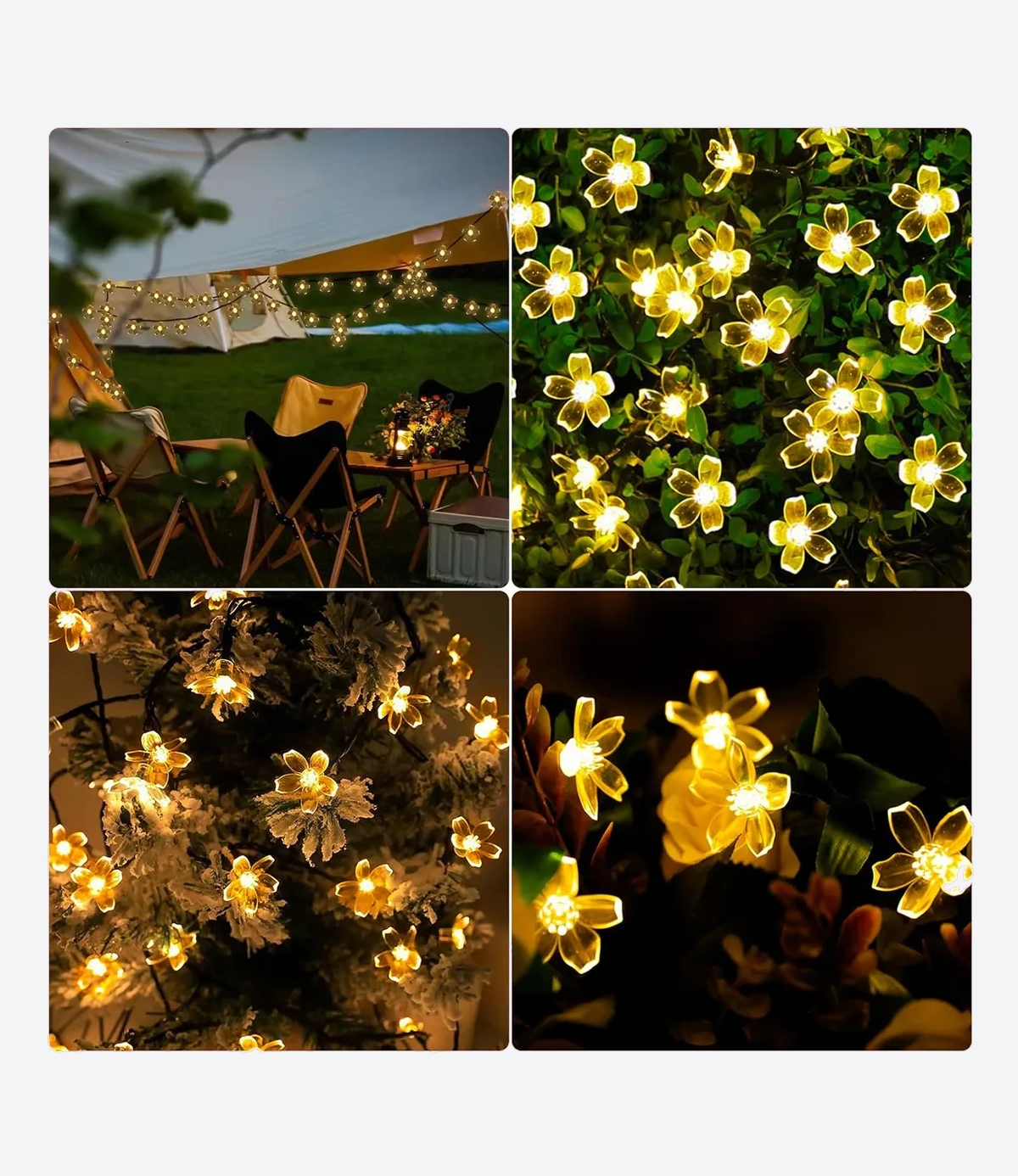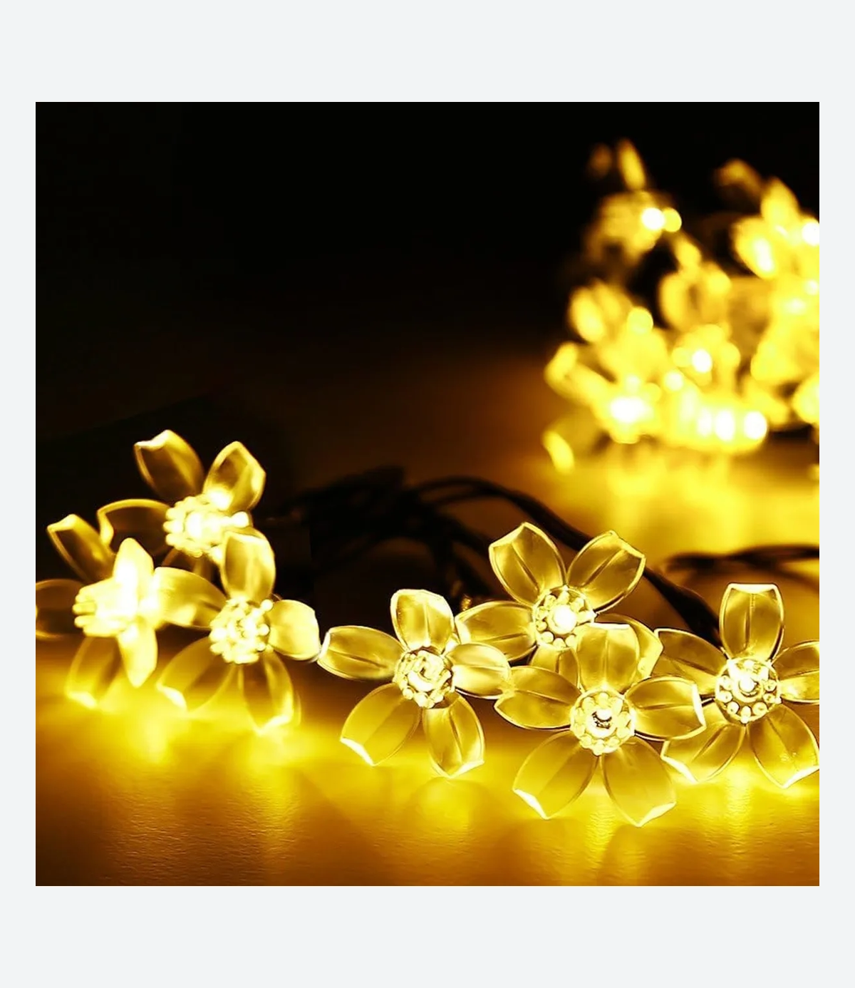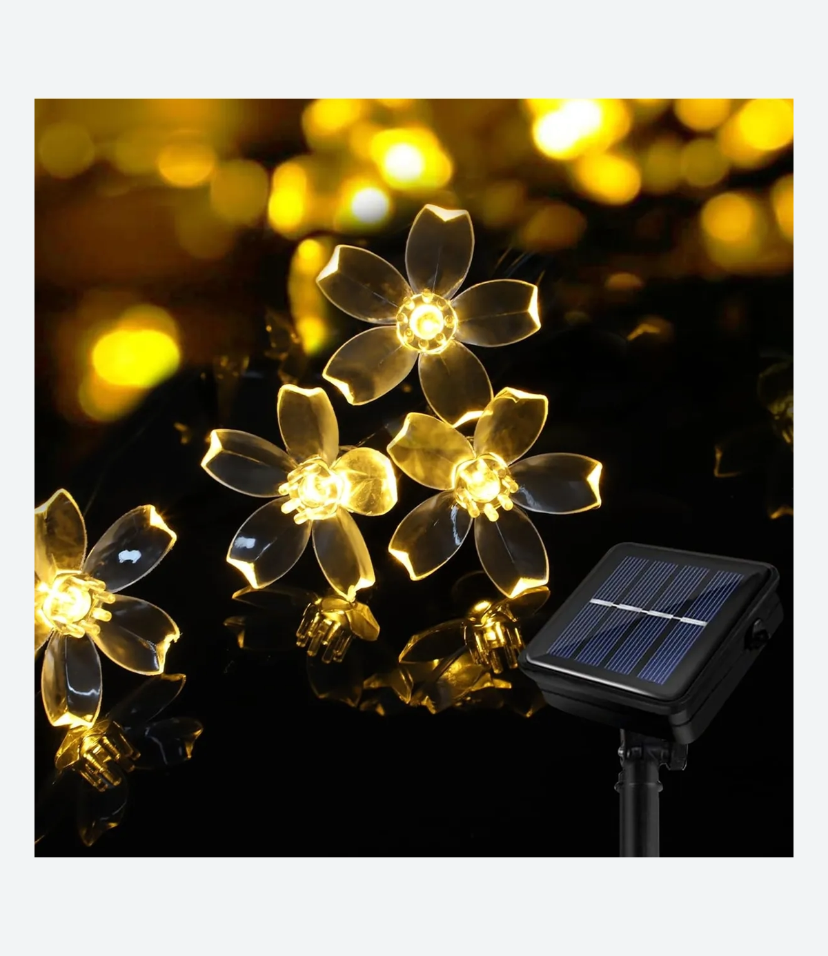 Hermosa guirnalda led de 30 Flores Cálidas compuesta por una tira de 6,5 mts de largo + un panel solar estaca.