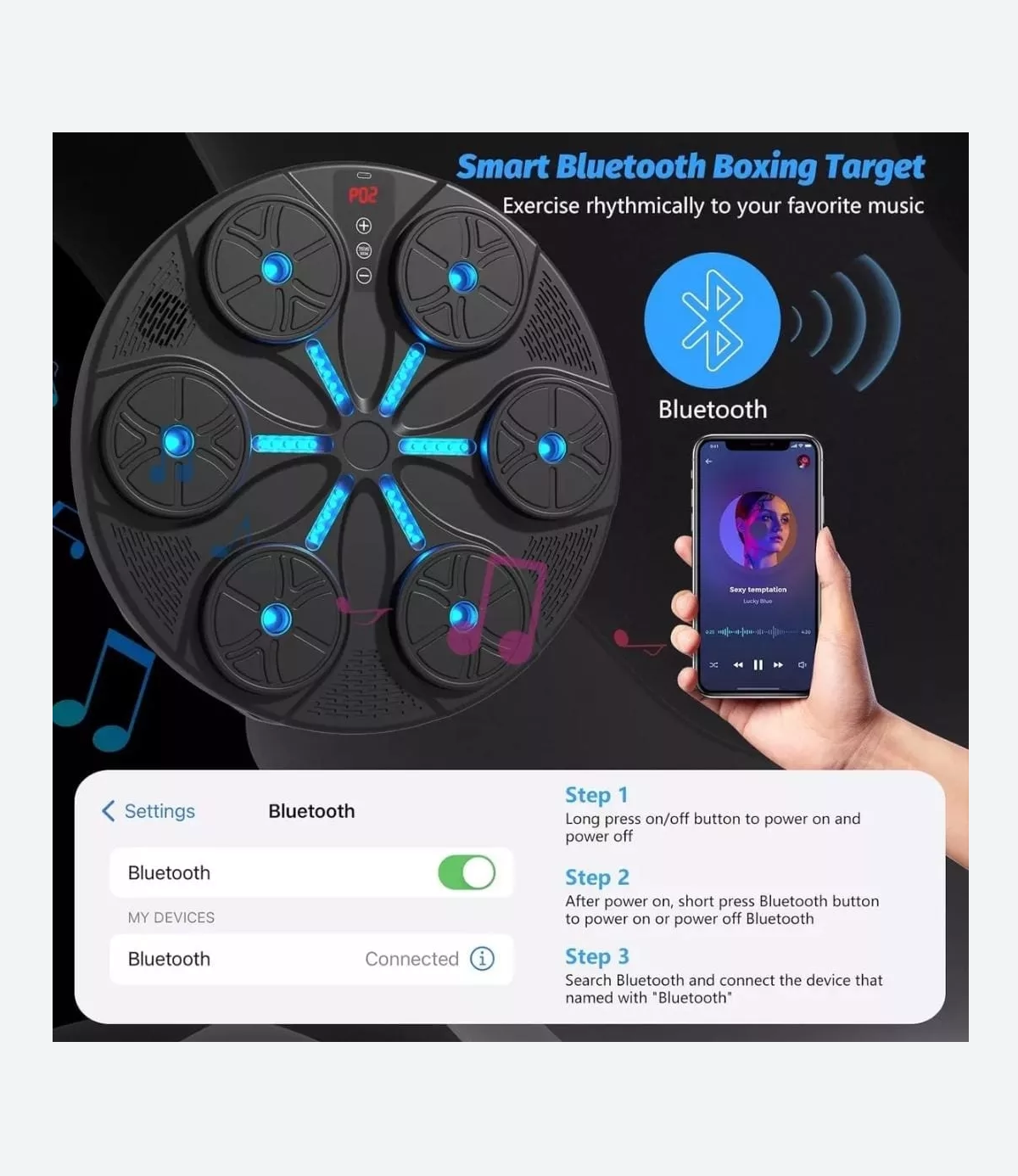 Integración Smart Fitness: Nuestra máquina inteligente de boxeo musical se conecta perfectamente a su teléfono inteligente a través de Bluetooth, lo que le permite elegir su música favorita para una experiencia de entrenamiento personalizada. Disfruta de la comodidad y la motivación de hacer ejercicio con tus canciones preferidas, haciendo que tu rutina de ejercicios sea más agradable y adaptada a tus preferencias.