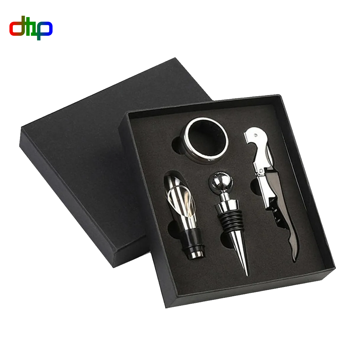 Es una Elegante caja de Negra de Carton Rigido con set 4 piezas para vino.