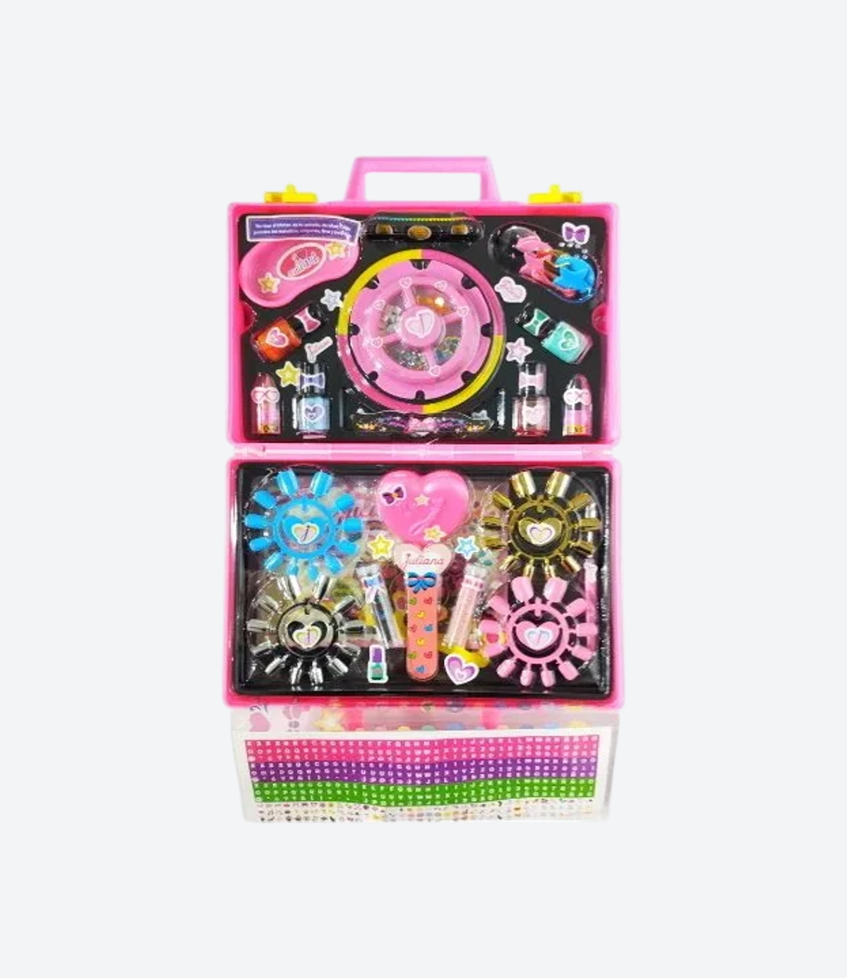 – Incluye: Uñas postizas, glitter, esmaltes de verdad, stickers para uñas, piedritas y apliques, lima, separador de dedos, crayones para tatoos, cajita corazón, hilo para dijes, dijes, bowls spa para manicura, pegamento para uñas.